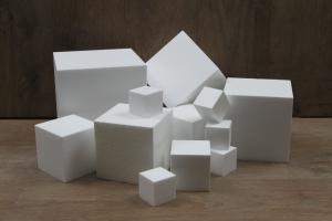 Piepschuim blokken, kubussen, schuimblokken of vormschuimblokken van polystyreen.